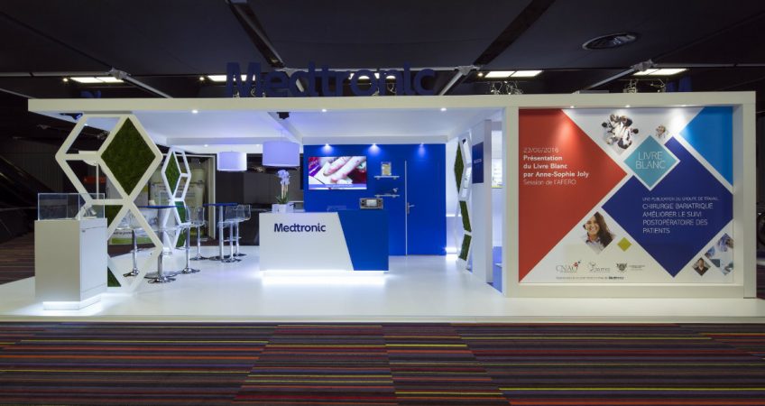 Notre menuiserie a dédié un espace de 1000 m2 au stockage des stands de nos clients récurrents qui souhaitent réutiliser l’un de leur stand phare exemple ci -dessous avec notre superbe stand Medtronic sur le salon de la Soffco à Nice au mois de juin.